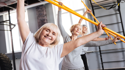 Drei ältere Frauen trainieren fröhlich mit gelben Widerstandsbändern in einem Fitnessstudio.